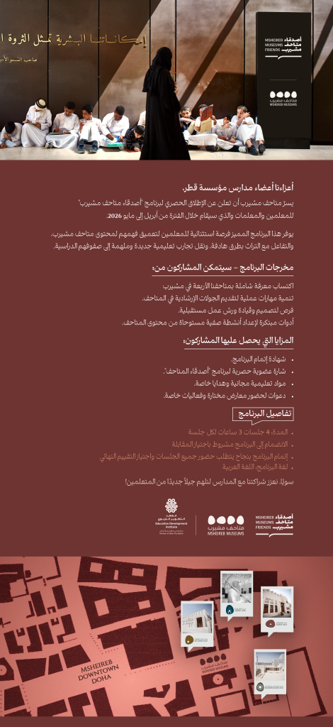يهدف برنامج «أصدقاء متاحف مشيرب» إلى تمكين المعلمين من تحويل زيارة المتحف إلى تجربة تعلم مرتبطة مباشرة بنواتج التعلم في المنهج.